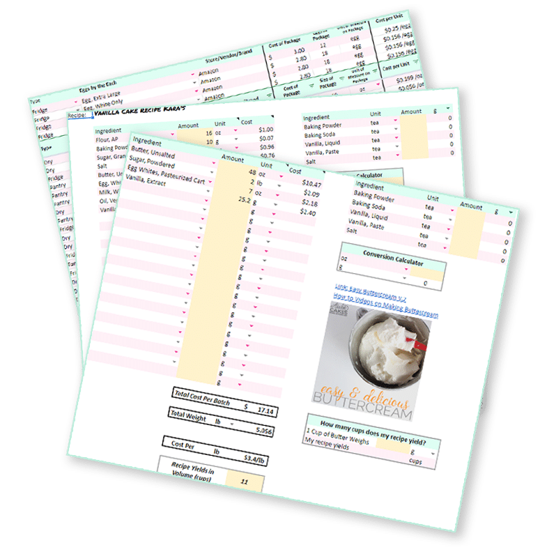 This free Recipe Cost Calculator Spreadsheet is one of the most invaluable tools for understanding your baking business. Furthermore… costing out your recipes is the FIRST step in understanding what you should be charging your customers (and how to NOT screw yourself over). Learn valuable information about your recipes, you'll even know how much 1 cup of batter costs you!